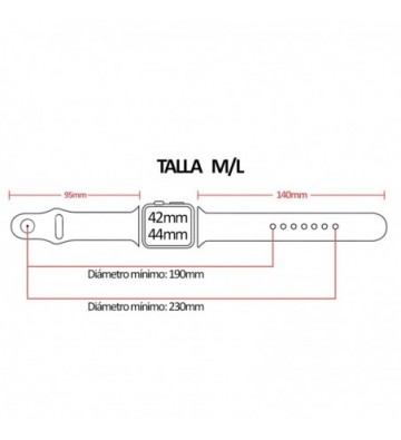 Correa de silicona de tacto suave de alta calidad para Apple Watch de 42mm / 44mm. Talla M/L, para muñecas de, aproximadamente, 190 a 230 mm. • 7 posiciones. • Broche metálico. • Perímetro mínimo aproximado: 190mm. • Perímetro máximo aproximado: 230mm. Compatible con Apple Watch: Series 1, Series 2, Series 3, Series 4. Silicona Metal