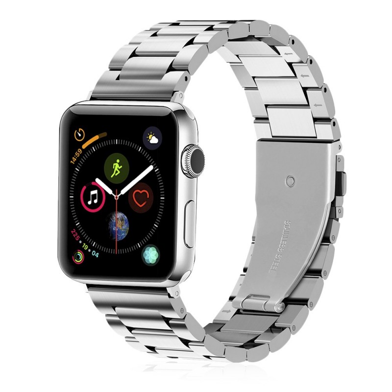 Correa de acero inoxidable tipo oyster para Apple Watch de 38mm / 40mm. • Cierre de seguridad. • Hasta 8 eslabones removibles. Compatible con Apple Watch: Series 1, Series 2, Series 3, Series 4 Acero_Inoxidable Aleación_de_Metal