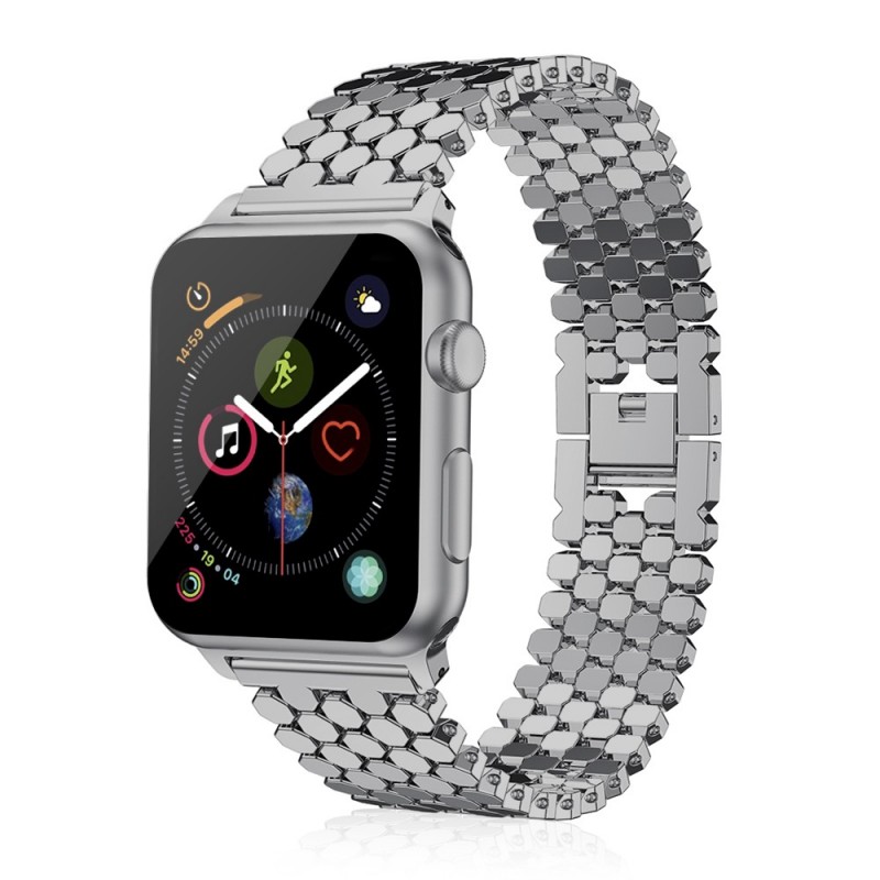 Correa de acero inoxidable diseño lamas y eslabones cierre mariposa oculto para Apple Watch de 38mm / 40mm. • Cierre de seguridad de mariposa oculto. • Múltiples eslabones removibles. • Perímetro mínimo: 160mm • Perímetro máximo: 218mm Compatible con Apple Watch: Series 1, Series 2, Series 3, Series 4. Metal Aleación_de_Metal