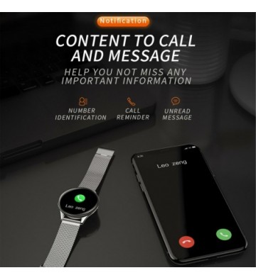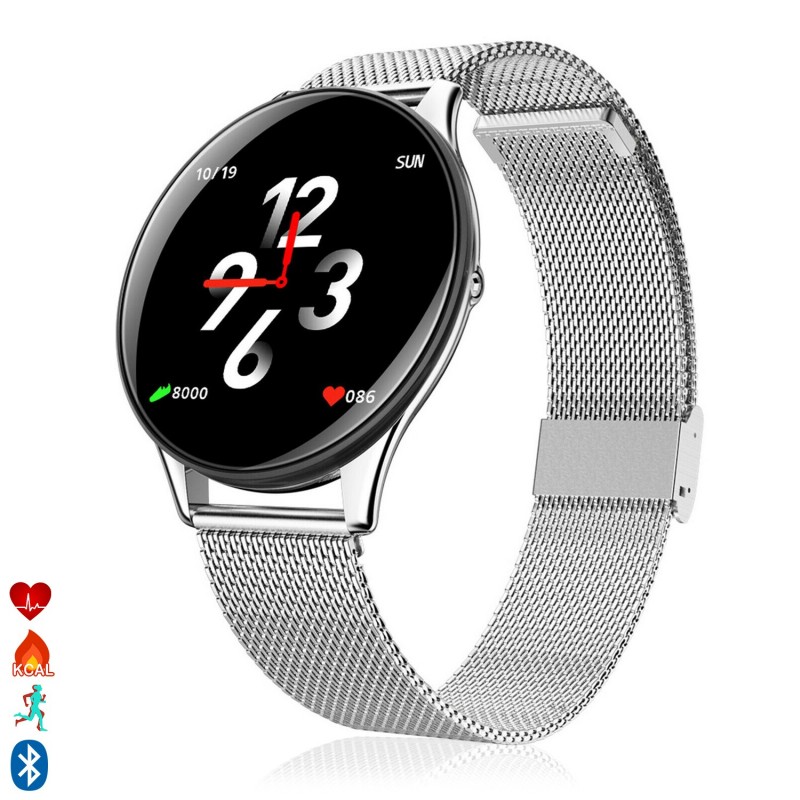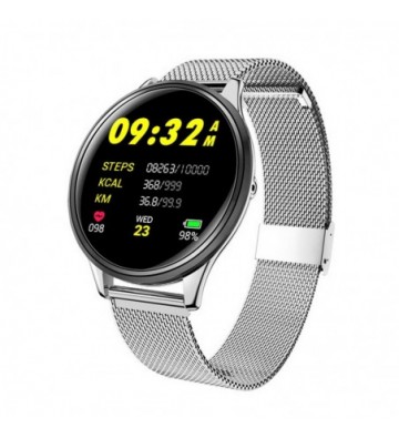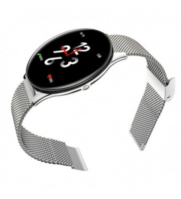Pulsera inteligente AK-SN58 con pantalla a color de 1,3 pulgadas y conexión Bluetooth. Correa metálica. Funciones: • Aviso de llamadas, SMS y Whatsapp mediante vibración (necesaria descarga de aplicación gratuita). • Función anti pérdida. • Alarma (configurables hasta tres mediante aplicación). • El tiempo. • Control remoto de la música del teléfono. • Disparo remoto de la cámara del teléfono. Funciones de salud: • Podómetro con contador de pasos. • Contador de calorías quemadas. • Distancia recorrida (en kilómetros). • Monitor cardíaco. • Medidor de presión sanguínea. • Medidor de oxígeno en sangre. • Ocho Modos Deportivos: Caminar, Correr, Ciclismo, Saltar, Bádminton, Baloncesto, Fútbol, Natación. • Monitor de sueño, con medidor de tiempo de sueño. • Control sedentario (configurable en la app). Tamaño de pantalla: 1,3 pulgadas de color IPS Resolución de pantalla: 240*240 Requisitos del sistema: Android 4.4 y superior, IOS 9.0 y superior Versión Bluetooth: BLE 4.0 Chip de control principal: Huntersun Hs6620D Capacidad de la batería: 150 mAh Tiem PVC Aleación_de_Metal