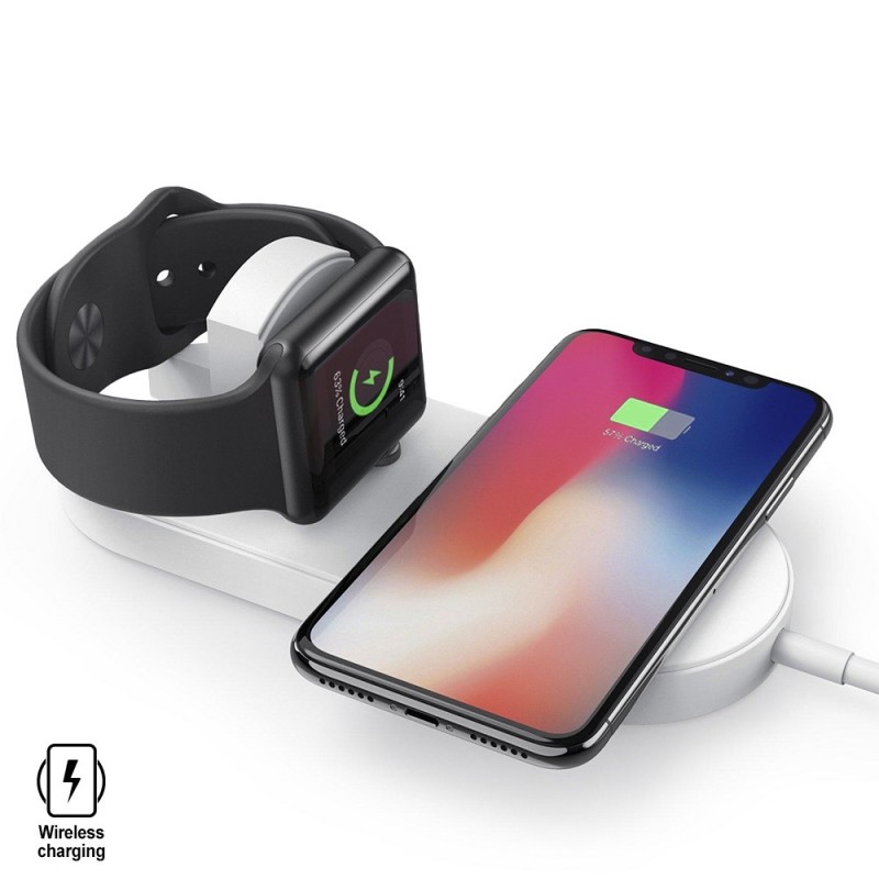 Cargador inalámbrico, dispone de una zona de carga Qi para iPhone, Samsung, Smartphones e iWatch y una segunda zona, inclinable, para Apple Watch.
