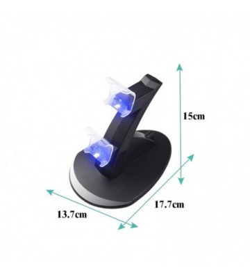 Stand de carga dual para mandos de PS4. • Led de estado de carga: rojo cargando, azul carga completa. • Alimentación a través del puerto USB, permite la carga simultánea de 2 mandos. • Incluye una conexión por cable que te permite cargar el mando sin dejar de utilizarlo. • Con un solo mando el tiempo de carga es de 2h; dos mandos simultáneos 4h. Salida de 5V de 200 a 400 mAH, Salida de 5V PVC Aleación_de_Metal