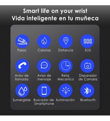 Smartwatch AK-NX05 movimiento de cuarzo analógico compatible con iOS (7.0 o superior) y Android (4.3 o superior). Funciones: • Control remoto de la cámara de tu smartphone. • Botón SOS • Aviso de llamadas entrantes • Notificacion de mensajes Funciones deportivas y de salud: • Podómetro con contador de pasos. • Medidor de calorías quemadas. • Distancia recorrida (en kilómetros). Bateria de pila de botón que permite un uso de hasta 365 dias. Chip : SI-BW03 Bluetooth : v4.0 Batería : Maxell (Japan) CR2430 Resistencia al agua : IP67 (5ATM) PVC Aleación_de_Metal