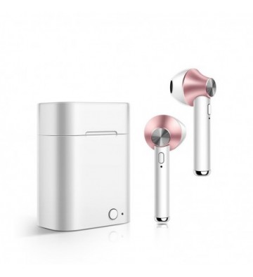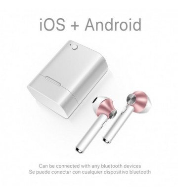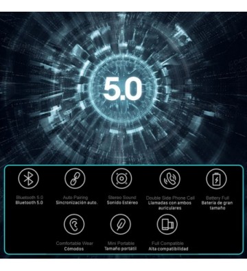 Auriculares estereo TWS con conexión Bluetooth 5.0 + EDR - TWS: True Wireless Stereo, consigue un sonido estereo sin cables, ambos auriculares se encuentran separados, con distinción de auricular izquierdo y derecho. - Bluetooth 5.0: conexión de ultra bajo consumo, transferencia de datos mejorada y menos interferencias. - Control de los auriculares: controla las funciones de emparejamiento, pasar canciones, etc. gracias a sus botones - Ligeros y ergonómicos: Ideales para hacer deporte, caminar, correr o realizar tu actividad favorita. - Disfruta de un sonido estero incluso durante las llamadas. - Emparejamiento automático: Después del primer emparejamiento, los auriculares se conectaran automáticamente a tu dispositivo. Los auriculares podrán ser utilizados conjuntamente, disfrutando de un sonido estereo real, o individualmente, especialmente útil mientras se utiliza su función manos libres. Incluyen micrófono incorporado. Incluye estación de carga y almacenamiento: mantendrás protegidos tus auriculares mientras no los utilizas. Posee una batería incorporada que te permitirá recargarlos sin necesidad de cables. Conexion de la base de carga por Micro Usb; directamente a la red electrica o a cualquier dispositivo USB que lo permita. Auriculares: Bluetooth: V5.0 Rango Bluetooth (sin obstáculos): 10 metros Batería: 40mAh, recargable, de iones de litio. Tiempo de carga: 1 hora aprox. Tiempo de uso: 2 horas x 6 veces Sensibilidad: 90db Base de Carga: Batería: 500mAh. Tiempo de carga: 1- PVC Aleación_de_Metal