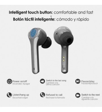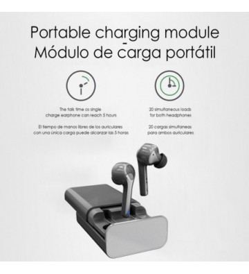 Auriculares G9 estéreo TWS con conexión Bluetooth 5.0 + EDR. • TWS: True Wireless Stereo, consigue un sonido estéreo sin cables, ambos auriculares se encuentran separados, con distinción de auricular izquierdo y derecho. • Bluetooth 5.0: conexión de ultra bajo consumo. • Powerbank incorporado, para cargar tu Smartphone, tablet o cualquier dispositivo con carga USB. Con una capacidad de 3000mAh. • Control de los auriculares: controla las funciones de emparejamiento, pasar canciones, etc. Gracias a sus botones multifunción, con acceso a tu asistente de voz Siri/Ok Google: - Activar asistente de voz: pulsar 2 veces el botón táctil. - Desactivar asistente de voz: pulsar 2 veces el botón táctil. - Pausar/Reanudar: pulsar 1 vez auricular izquierdo o derecho. - Anterior canción: pulsar 2 segundos el auricular izquierdo. - Siguiente canción: pulsar 2 segundos el auricular derecho. - Responder llamada/colgar: pulsa el botón en cualquier auricular. - Rechazar llamada: pulsar 2 segundos en cualquier auricular - Cambiar entre llamadas: pulse 2 veces 2 segundos el auricular izquierdo o derecho. - Mantener 1ª llamada y responder a la 2ª llamada: pulse 2 veces 2 segundos el auricular izquierdo o derecho. - Colgar 1ª llamada y responder a la 2ª llamada: pulse 1 vez el auricular izquierdo o derecho. - Rechazar llamada mientras se mantiene conversación: mantener pulsado 2 segundos el auricular izquierdo o derecho. • Emparejamiento automático: Después del primer emparejamiento, los auriculares se conectaran automáticamente a tu dispositivo. • Disfruta de un sonido estero incluso durante las llamadas. Sonido claro, gracias a la reducción de ruido pasiva. • Compatible con la mayoría de dispositivos Bluetooth incluido Android e iOS. Conéctalos a tu smartphone, iPad, PC, etc. • Los auriculares podrán ser utilizados conjuntamente, disfrutando de un sonido estereo real, o individualmente, especialmente útil mientras se utiliza su función manos libres. Incluyen micrófono incorporado. • Incluye estación de carga y almacenamiento: mantendrás protegidos tus auriculares mientras no los utilizas. Posee una batería incorporada que te permitirá recargarlos sin necesidad de cables. Conexión de la base de carga por USB-C; directamente a la red eléctrica o a cualquier dispositivo USB-C que lo permita. Bluetooth: V5.0 Rango Bluetooth (sin obstáculos): 10-15 metros Relación señal ruido (SNR): 98dB Baterías de los auriculares: 2x60mAh Tiempo de carga: 1.5 horas aprox. Tiempo de uso: hasta 5 horas Tiempo de uso en stand-by: hasta 100 horas Modos Bluetooth: PVC Aleación_de_Metal