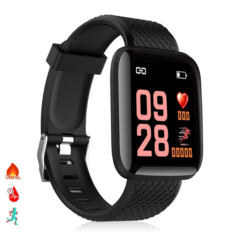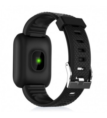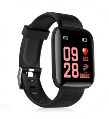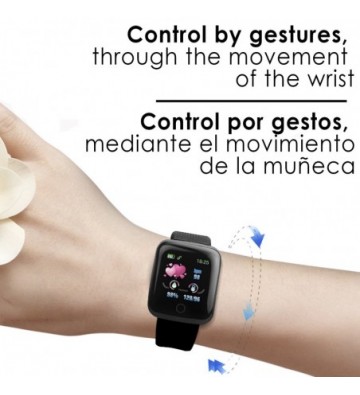Brazalete inteligente ID116 con conexión Bluetooth 4.0. Pantalla a color táctil de 1’3”. Compatible con iOS (8.0 o superior) y Android (4.3 o superior). Correa regulable. Incluye cable cargador. Funciones: • Aviso de llamadas, con muestra el pantalla del nombre o número del llamante. • Notificaciones de aplicaciones: como Facebook, Whatsapp, SMS, etc. Con muestra en pantalla del mensaje recibido (necesaria descarga de aplicación gratuita). • Control por gestos, mediante el movimiento de la muñeca. • Modo no molestar. • Alarma (configurable desde app). • Función antipérdida y búsqueda de teléfono. Funciones de salud: • Monitor cardíaco. • Medición de presión sanguínea. • Podómetro con contador de pasos. • Distancia recorrida (en kilómetros). • Contador de calorías quemadas. • Modo multideportivo: salto a la comba, abdominales y running/andar. • Monitor de sueño (mediante app). • Objetivo de ejercicio (a través de app). • Control sedentario (a través de app). Chip: Telink 8266 Memoria: 512kb+16kb Compatible: IOS 8.0 y Android 4.3 o superiores Bluetooth: 4.0 Batería: 150mAh de litio Duración de la batería en reposo: hasta 10 días Duración de la batería en uso normal: hasta 7 días Pantalla: TFT a color de 1’3” PVC Aleación_de_Metal