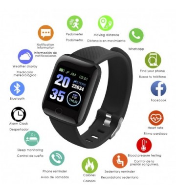 Brazalete inteligente ID116 con conexión Bluetooth 4.0. Pantalla a color táctil de 1’3”. Compatible con iOS (8.0 o superior) y Android (4.3 o superior). Correa regulable. Incluye cable cargador. Funciones: • Aviso de llamadas, con muestra el pantalla del nombre o número del llamante. • Notificaciones de aplicaciones: como Facebook, Whatsapp, SMS, etc. Con muestra en pantalla del mensaje recibido (necesaria descarga de aplicación gratuita). • Control por gestos, mediante el movimiento de la muñeca. • Modo no molestar. • Alarma (configurable desde app). • Función antipérdida y búsqueda de teléfono. Funciones de salud: • Monitor cardíaco. • Medición de presión sanguínea. • Podómetro con contador de pasos. • Distancia recorrida (en kilómetros). • Contador de calorías quemadas. • Modo multideportivo: salto a la comba, abdominales y running/andar. • Monitor de sueño (mediante app). • Objetivo de ejercicio (a través de app). • Control sedentario (a través de app). Chip: Telink 8266 Memoria: 512kb+16kb Compatible: IOS 8.0 y Android 4.3 o superiores Bluetooth: 4.0 Batería: 150mAh de litio Duración de la batería en reposo: hasta 10 días Duración de la batería en uso normal: hasta 7 días Pantalla: TFT a color de 1’3” PVC Aleación_de_Metal