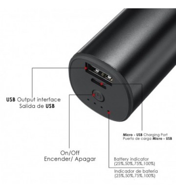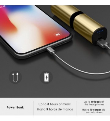 • Powerbank incorporado, para cargar tu Smartphone, tablet o cualquier dispositivo con carga USB. Con una capacidad de 1200mAh.