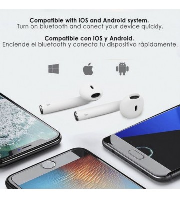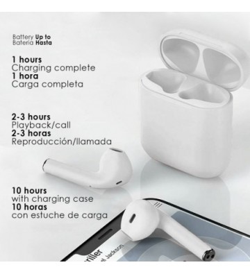 Auriculares DAM D120 TWS Bluetooth 5.0. • Conexión rápida con ventana emergente. • Modo estéreo TWS. • Auriculares con encendido automático inteligente. Conexión automática (una vez emparejado en el primer uso). • Auriculares táctiles con funciones de control de reproducción y llamadas. • Bluetooth 5.0 de última generación con bajo consumo y largo alcance. • Llamadas en estéreo. • Base carga con cierre magnético. • Acceso a Siri desde los auriculares. • Incluyen cable de carga USB-Lightning 8 pins. Bluetooth: 5.0 Protocolo: A2DP/HFP/AVRCP/SPP Alcance bluetooth: hasta 15 metros Tiempo de carga: aprox. 1 hora Tiempo de uso: hasta 2-3 horas Tiempo en espera: aprox. 120 horas Batería de los auriculares: 2x 35mAh Batería de la base de carga: 350mAh Sensi PVC Aleación_de_Metal
