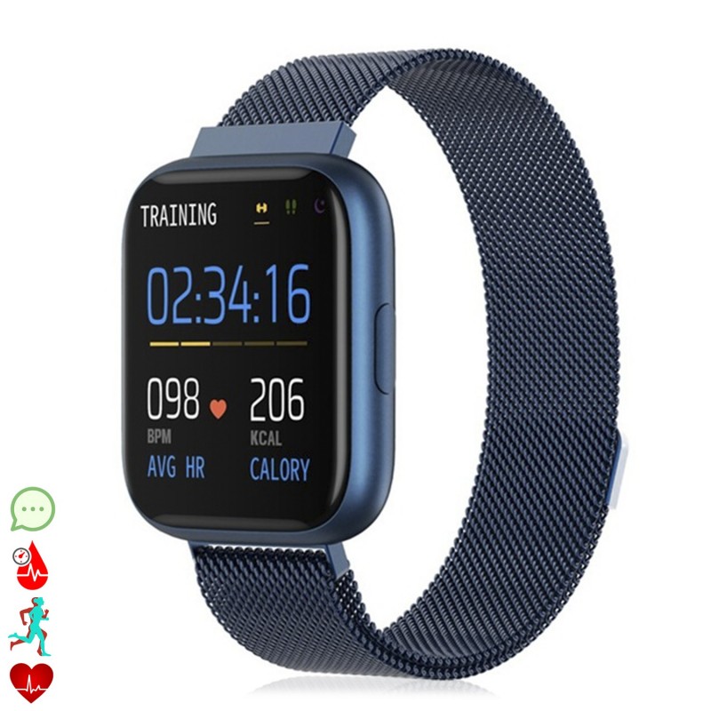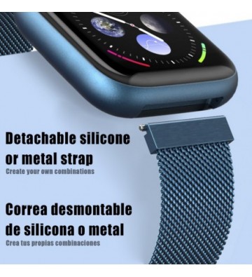 Smartwatch deportivo P6 con correa metálica. Pantalla totalmente táctil de 1.4 pulgadas IPS, con 240x240 px de resolución. Funciones: • Sincronización y aviso de notificaciones del teléfono, como email, Whatsapp, Facebook, Twitter, etc y SMS. Compatible con dispositivos Android e iOS mediante aplicación gratuita • Aviso de llamadas. • Control de los archivos MP3 de tu teléfono móvil. • Función de avisos mediante vibración. • Control remoto de la cámara del Smartphone. • Alarma. • Información meteorológica en pantalla (mediante app). Funciones de salud: • Monitor cardíaco, con registro de pulsaciones. • Medición de presión sanguínea. • Medición de oxígeno en sangre. • Podómetro con contador de pasos, tiempo de actividad, calorías quemadas, distancia recorrida y velocidad. • Modo multideportivo: - Andar: tiempo, pasos, distancia, calorías y pulsaciones. - Correr: tiempo, pasos, distancia, calorías y pulsaciones. - Ciclismo: tiempo, calorías y pulsaciones. - Fútbol: tiempo, pasos, calorías y pulsaciones. - Baloncesto: tiempo, pasos, calorías y pulsaciones. - Saltos a la comba: tiempo, calorías y pulsaciones. - Bádminton: tiempo, pasos, calorías y pulsaciones. • Recordatorio de actividad (aviso de sedentarismo) con alarma mediante vibración. • Monitor de sueño, con indicador de tiempo y calidad del mismo (sueño profundo y ligero). Compatible con pulsera intercambiables, con sistema Quick-Easy, de 20mm. Chip: Import Nordic NRF52832 Pantalla táctil 1.54pulgadas HD Resolución: 240x240 px Compatibilidad: Android 4.3 y IOS 8.0 ó superior Batería: 130mAh, hasta 4 días de uso y 7 en reposo Sumergible, IP 67 PVC Aleación_de_Metal