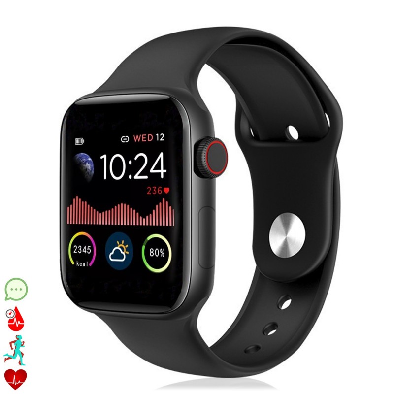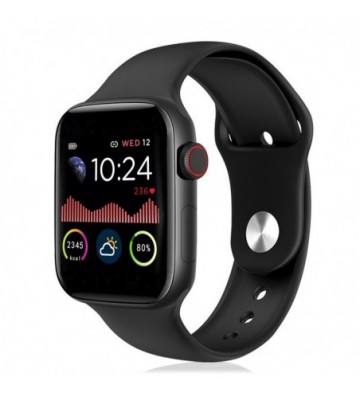 Smartwatch deportivo W58. Pantalla totalmente táctil de 1.3 pulgadas. Funciones: • Sincronización y aviso de notificaciones del teléfono, como email, Whatsapp, Facebook, Twitter, etc y SMS. Compatible con dispositivos Android e iOS mediante aplicación gratuita • Aviso de llamadas. • Control de los archivos MP3 de tu teléfono móvil. • Función de avisos mediante vibración. • Control remoto de la cámara del Smartphone. • Alarma. • Información meteorológica en pantalla (mediante app). Funciones de salud: • Termómetro de medición de temperatura corporal • Monitor cardíaco, con registro de pulsaciones. • Medición de presión sanguínea. • Medición de oxígeno en sangre. • Podómetro con contador de pasos, tiempo de actividad, calorías quemadas, distancia recorrida y velocidad. • Modo multideportivo: - Andar: tiempo, pasos, distancia, calorías y pulsaciones. - Correr: tiempo, pasos, distancia, calorías y pulsaciones. - Ciclismo: tiempo, calorías y pulsaciones. • Recordatorio de actividad (aviso de sedentarismo) con alarma mediante vibración. • Monitor de sueño, con indicador de tiempo y calidad del mismo (sueño profundo y ligero). Pulsera desmontable. Pulsera desmontable. Pantalla totalmente táctil 1.3 pulgadas HD Resolución: 240x240 px Compatibilidad: Android 4.4 y IOS 8.5 ó superior. Bluetooth: 5.1 Batería: 170mAh. PVC Aleación_de_Metal