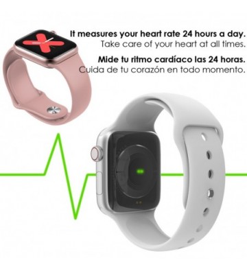 Smartwatch deportivo W58. Pantalla totalmente táctil de 1.3 pulgadas. Funciones: • Sincronización y aviso de notificaciones del teléfono, como email, Whatsapp, Facebook, Twitter, etc y SMS. Compatible con dispositivos Android e iOS mediante aplicación gratuita • Aviso de llamadas. • Control de los archivos MP3 de tu teléfono móvil. • Función de avisos mediante vibración. • Control remoto de la cámara del Smartphone. • Alarma. • Información meteorológica en pantalla (mediante app). Funciones de salud: • Termómetro de medición de temperatura corporal • Monitor cardíaco, con registro de pulsaciones. • Medición de presión sanguínea. • Medición de oxígeno en sangre. • Podómetro con contador de pasos, tiempo de actividad, calorías quemadas, distancia recorrida y velocidad. • Modo multideportivo: - Andar: tiempo, pasos, distancia, calorías y pulsaciones. - Correr: tiempo, pasos, distancia, calorías y pulsaciones. - Ciclismo: tiempo, calorías y pulsaciones. • Recordatorio de actividad (aviso de sedentarismo) con alarma mediante vibración. • Monitor de sueño, con indicador de tiempo y calidad del mismo (sueño profundo y ligero). Pulsera desmontable. Pulsera desmontable. Pantalla totalmente táctil 1.3 pulgadas HD Resolución: 240x240 px Compatibilidad: Android 4.4 y IOS 8.5 ó superior. Bluetooth: 5.1 Batería: 170mAh. PVC Aleación_de_Metal