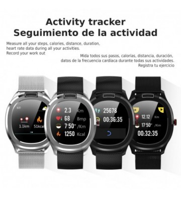 • Seguimiento de actividad, monitorización de pasos, calorías, distancia, duración, frecuencia cardíaca.