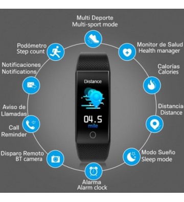 Pulsera inteligente T01: Funciones: • Aviso de llamadas. Sincroniza con el teléfono móvil y muestra el nombre de la persona que llama. • Notificaciones, con mensaje en pantalla. • Otros: obturador de cámara remoto, reloj despertador, etc. Funciones de salud: • Termómetro de temperatura corporal. Monitoriza en tiempo real los cambios de temperatura corporal. • Podómetro: registro de distancia, quema de calorías y modos multideportivos: correr, baloncesto, caminar, montaña, tenis de mesa, bádminton, fútbol y natación. • Monitor de ritmo cardíaco y monitor de sueño. Sincroniza y guarda los datos en la APP. Especificaciones: • Chip: BK3431Q • Tipo de sensor de ritmo cardíaco: HRS3300 • Bluetooth: Versión 4.0 • Compatible: Android 4.4 e IOS 10.0 y superior • Batería: Batería de polímero de litio de 90mAh • Tiempo de espera: hasta 7 días • A prueba de agua: Nivel superior de impermeabilidad IP68 • APP: Youth Health PVC Aleación_de_Metal