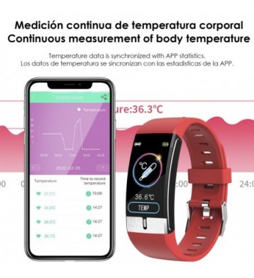 Pulsera inteligente E66 multifunción: Funciones: • Notificaciones de aplicaciones . • Alertas de llamadas, alarmas y redes sociales (Wechat, Facebook, Twitter, etc.). • Correa de TPU respetuosa con el medio ambiente. • Pantalla a color de alta definición, interfaz de usuario dinámica y sencilla. • Otras funciones: Disparador remoto, aviso de sedentarismo, anti pérdida. • Al girar la muñeca la pantalla se enciende automáticamente. Funciones de salud: • Función de control de la temperatura. • Función de electrocardiograma ECG. • Control de la frecuencia cardíaca, presión arterial (tensión) y oxígeno en la sangre • Modo multideporte (carrera, ciclismo, natación, bádminton). Con estimación de grasa corporal, conteo de pasos, calorías, distancia. • Monitor del sueño. Tamaño de la pantalla: TFT, 1.08 Pantalla a color Bluetooth: 4.0 bajo consumo Tipo de batería: Batería de litio Capacidad de la batería: 105mAh Tiempo de carga: Desde 2 horas Tiempo de uso: hasta 5 días, en espera: hasta 20 días Android 4.4 y superior, iOS 8.2 y superior. PVC Aleación_de_Metal