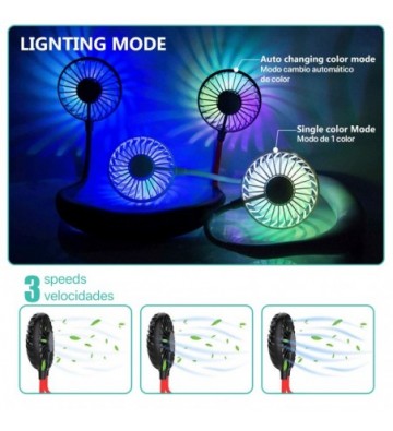 Ventilador portátil para cuello. • Se puede usar colgado en el cuello, podrás llevarlo a cualquier lugar que desees. • Diseño mejorado preparado para uso continuado sin molestias en el cuello. • Carga por USB y batería duradera: El mini ventilador es compatible con todos los dispositivos de salida USB y se suministra con cable de datos USB, para resolver problemas de carga en cualquier momento. El ventilador de 2000 mAh batería solo debe cargarse 2-3 horas y puede funcionar de hasta 8 horas en función de la velocidad elegida. • Ruido reducido: Hecho de un motor sin escobillas de cobre de alta calidad, este ventilador personal produce un viento más fuerte, suave y silencioso. El bajo nivel de ruido del mini ventilador portátil no lo molestará durante el ejercicio o el trabajo, lo que lo hará verdaderamente relajarse para disfrutar del viento fresco y tranquilo. • 3 velocidades ajustables. • Rotación 360: las dos cabezas del mini ventilador pueden girarse 360 grados. • Control con un solo botón (encendido / apagado y velocidad del viento), fácil de usar. • Dispones de luz LED en cada uno de los ventiladores, con cambio de color. • Incluye algodone centrales para difundir aromaterapia y perfumes. Batería: 2000mAh Tipo de batería: 18650 Tiempo de uso: hasta 8 horas Tiempo de carga: 2-3 horas Motor: sin escobillas Velocidades: 3 PVC Aleación_de_Metal