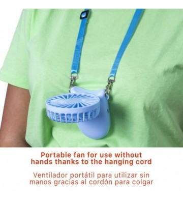 Mini ventilador de mano con bateria recargable con lanyard para llevar colgado.