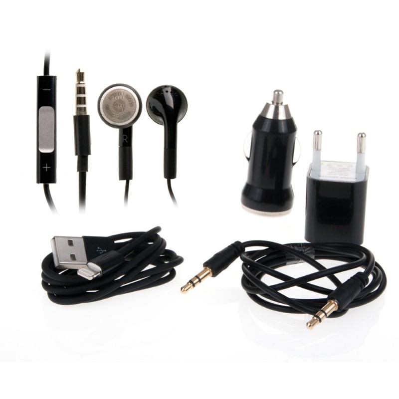 Pack compatible con iPhone 5,6,6 Plus, contiene; - Adaptador de carga de automóvil, mediante USB -Adaptador de pared mediante USB -Auriculares miniJack 3,5 con control de volumen y micrófono -Cable de datos iPhone 5,6,6 Plus -Cable miniJack 3,5 a miniJack 3,5 Adaptador de automóvil : Entrada de voltaje; 12 24 V. Salida de voltaje; 5 V 1000mA Adaptador de pared : Enreada de voltaje; AC110 240 V. Salida de voltaje; DC 5V 1000mA PVC Aleación_de_Metal