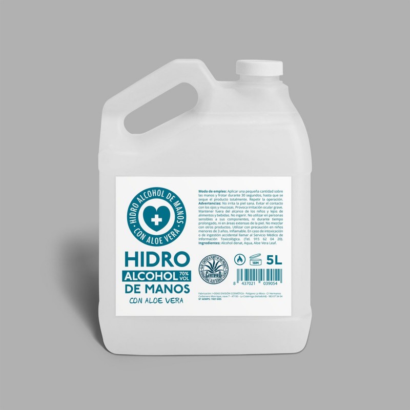 • Solución hidroalcohólica líquida, exclusivamente con etanol 96º y aloe vera con certificados ecológicos regional y europeo. • Producto totalmente natural. • Nuestra solución no sólo garantiza el 70% de volumen en alcohol y la máxima eficacia, sino también la posibilidad de que sea pulverizada, lo que facilita su aplicación dérmica y/o en guantes u otras superficies. • Garrafa de 5 litros. Alcohol denat, agua, extracto de Aloe Vera