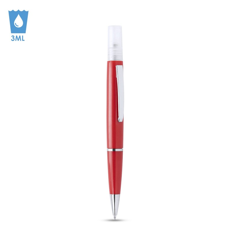 Bolígrafo higienizante con pulverizador recargable integrado y capucha protectora. Acabado en resistente ABS brillante con elegante clip metálico y cómoda empuñadura y escritura en tinta azul. Capacidad del pulverizador 3ml. Líquido no incluido. ABS y aleación de metal