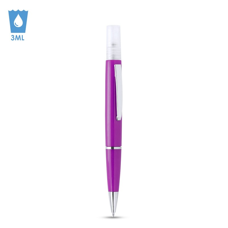 Bolígrafo higienizante con pulverizador recargable integrado y capucha protectora. Acabado en resistente ABS brillante con elegante clip metálico y cómoda empuñadura y escritura en tinta azul. Capacidad del pulverizador 3ml. Líquido no incluido. ABS y aleación de metal