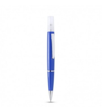 Bolígrafo higienizante con pulverizador recargable integrado y capucha protectora. Acabado en resistente ABS brillante con elegante clip metálico y cómoda empuñadura y escritura en tinta azul. Capacidad del pulverizador 3ml. Líquido no incluido. ABS y aleación de metal