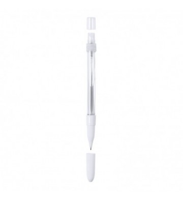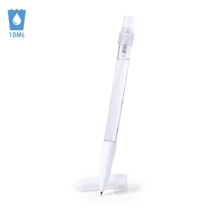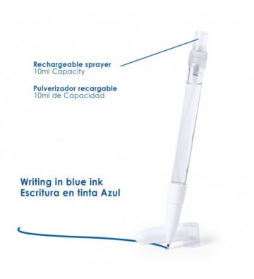 Bolígrafo higienizante con pulverizador recargable integrado y capucha protectora. Acabado en resistente ABS brillante y escritura en tinta azul. Capacidad del pulverizador 10ml. Líquido no incluido. Disponible en color blanco. ABS y aleación de metal
