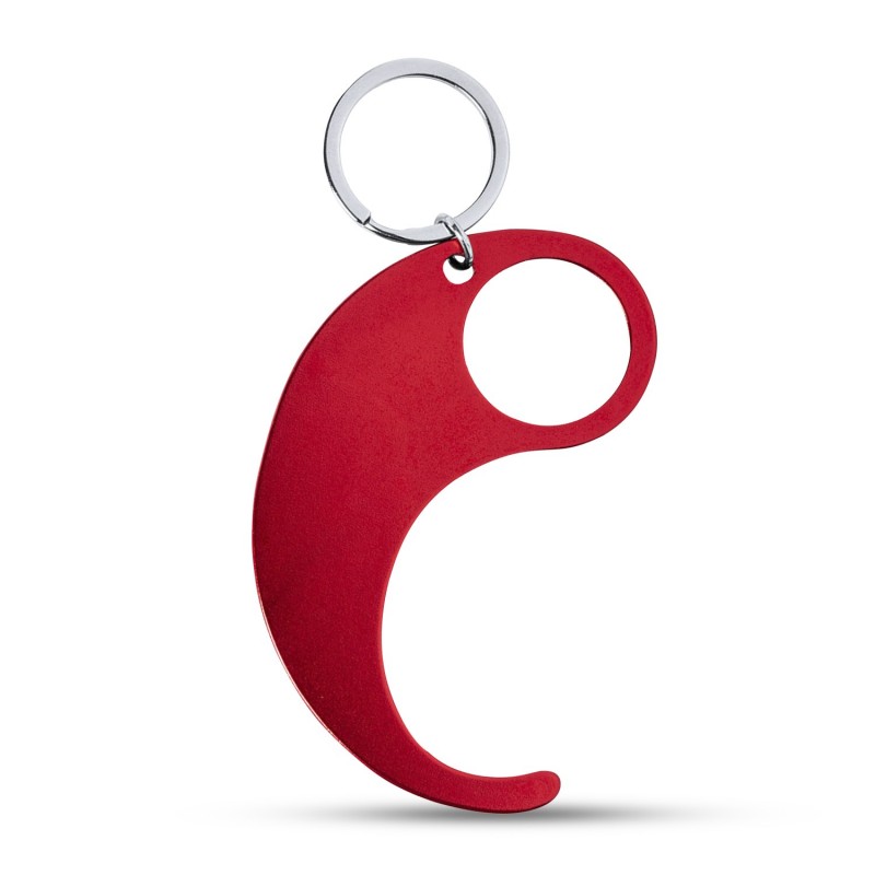 Llavero higiénico anti-contacto, fabricado en resistente Aluminio. El único llavero diseñado especialmente para uso en transporte público y evitar tocar con las manos superficies de uso común (manivelas de puertas, interruptores, grifos de uso público, cajeros automáticos...). Dispone de amplia zona de marcaje y cómodo troquel para el dedo. Acabado en aluminio en vivos y variados colores. Presentado en bolsita de diseño individual. Aluminio