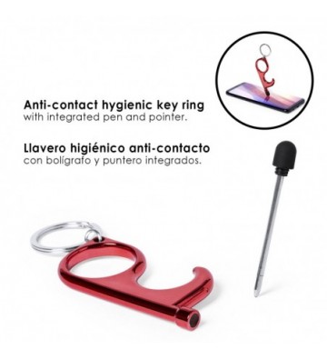 Llavero higiénico anti-contacto con bolígrafo y puntero integrados. Fabricado en resistente ABS de acabado metalizado y disponible en variada gama de colores. Especialmente diseñado para evitar tocar con las manos superficies de uso común (manivelas de puertas, interruptores, grifos de uso público, cajeros automáticos...). Con cómodo troquel para el dedo y presentado en bolsa individual de diseño. ABS