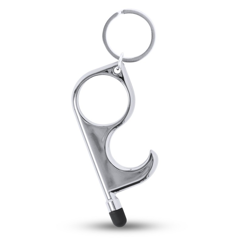 Llavero higiénico anti-contacto con bolígrafo y puntero integrados. Fabricado en resistente ABS de acabado metalizado y disponible en variada gama de colores. Especialmente diseñado para evitar tocar con las manos superficies de uso común (manivelas de puertas, interruptores, grifos de uso público, cajeros automáticos...). Con cómodo troquel para el dedo y presentado en bolsa individual de diseño. ABS