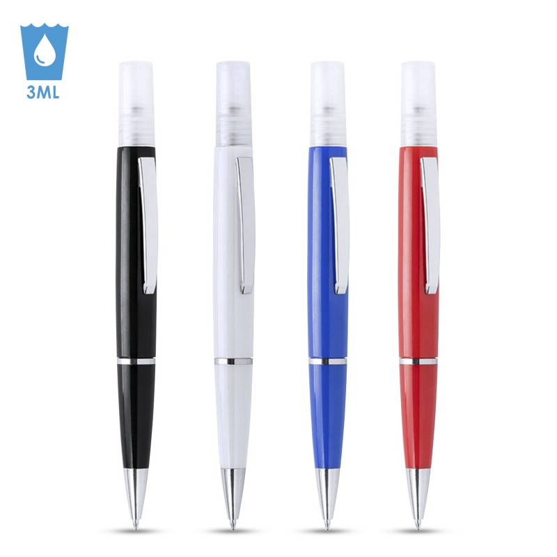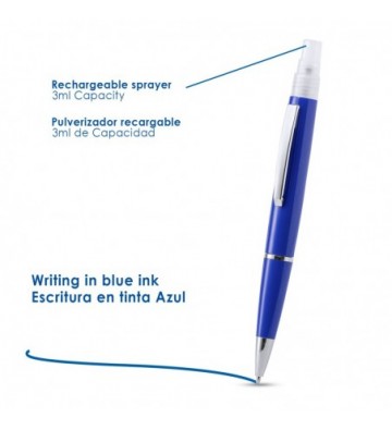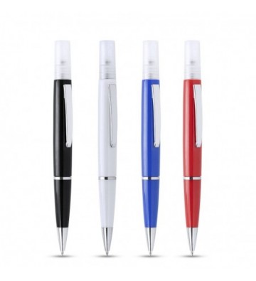 Bolígrafo higienizante con pulverizador recargable integrado y capucha protectora. Acabado en resistente ABS brillante con elegante clip metálico y cómoda empuñadura y escritura en tinta azul. Capacidad del pulverizador 3ml. Líquido no incluido. Contiene 4 unidades en colores: azul, negro, rojo y blanco ABS y aleación de metal