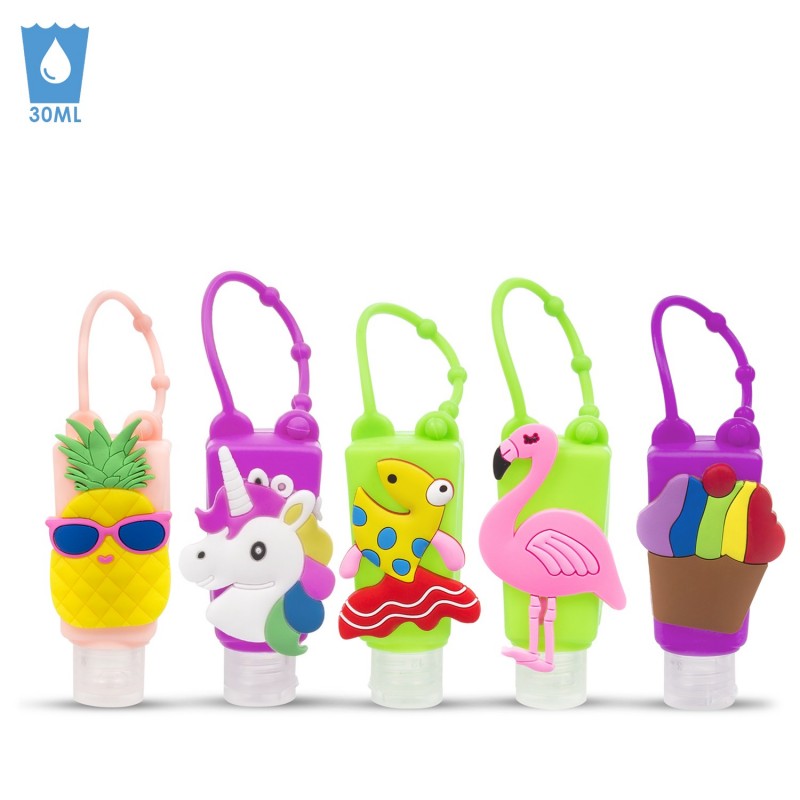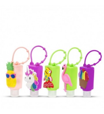 Llavero colgante con botella higienizante de manos. • Botella porta alcohol o hidrogel, rellenable, con 30ml de capacidad. • Tapón de apertura rápida, anti goteo, desenroscable para rellenar. • Colgante ajustable incorporado, para llevar junto con tus llaves o colgar de tu bolso, mochila, etc. Pack de 5 uds. Diseños FANTASY-3 variados. Silicona y PVC