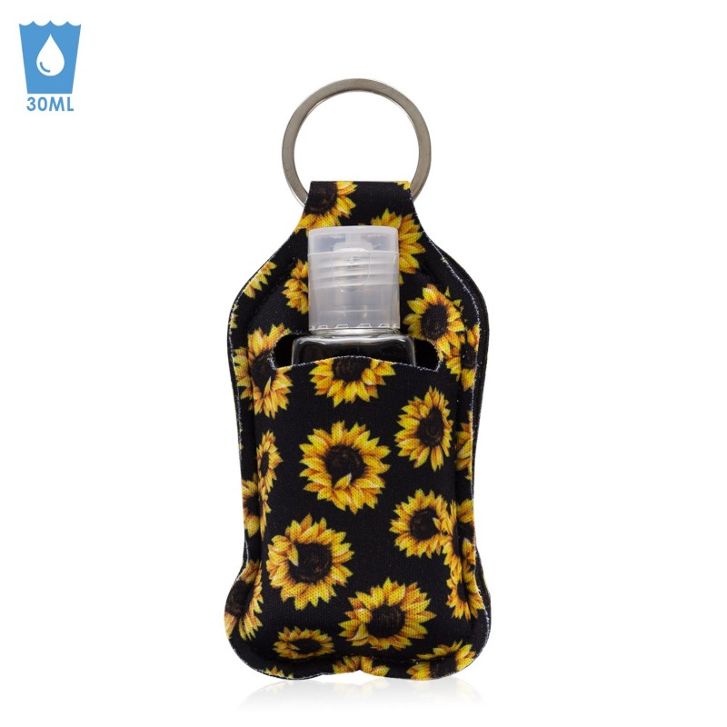 Llavero botella higienizante de manos alcohol rellenable 30ml tejido diseño girasol negro.