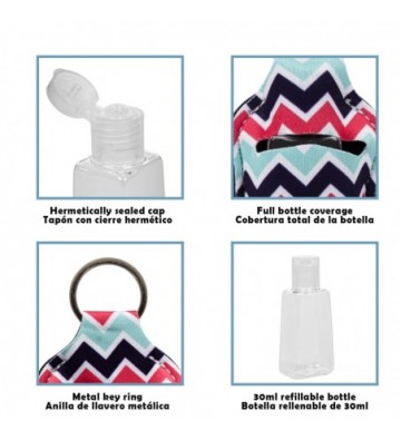 Llavero botella higienizante de manos. • Botella porta alcohol o hidrogel, rellenable, con 30ml de capacidad. • Funda de tela con diseño personalizado. Podrás cubrir completamente la botella para cuando no lo uses periódicamente. • Tapón de apertura rápida, anti goteo, desenroscable para rellenar. • Anilla llavero para llevar junto con tus llaves o colgar de tu bolso, mochila, etc. Poliéster y PVC.