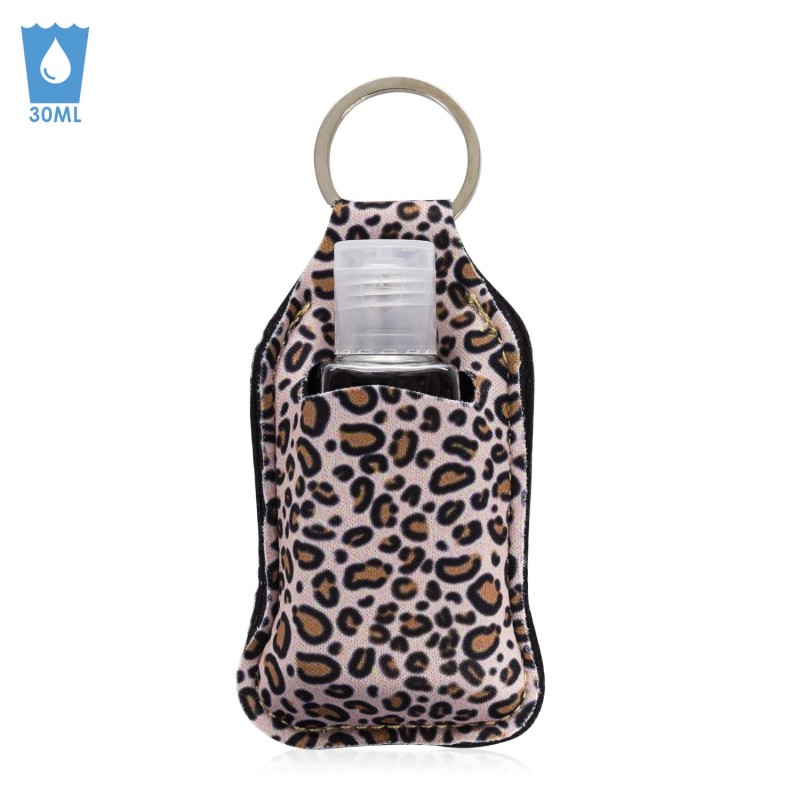 Llavero botella higienizante de manos alcohol rellenable 30ml tejido diseño guepardo.