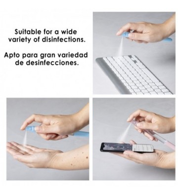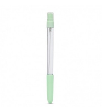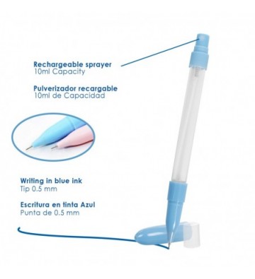 Bolígrafo higienizante con pulverizador recargable integrado y capucha protectora. • Acabado en resistente ABS, escritura en tinta azul. • Líquido no incluido. Capacidad: 10ml Grosor de la punta: 0.5mm PVC
