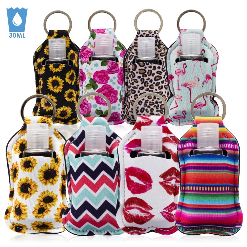 Llavero botella higienizante de manos alcohol rellenable 30ml tejido. Pack de 8 uds. Diseños variados.