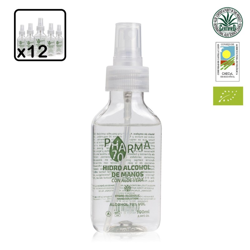 HA70 Pulverizador 100 ml hidro alcohol con Aloe Vera Ecológica. Pack de 12 uds.