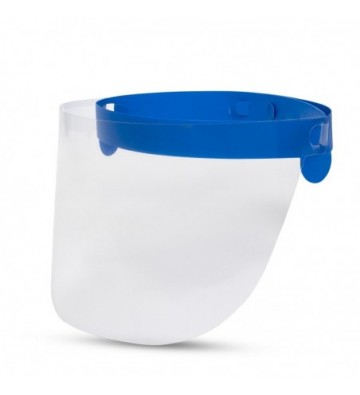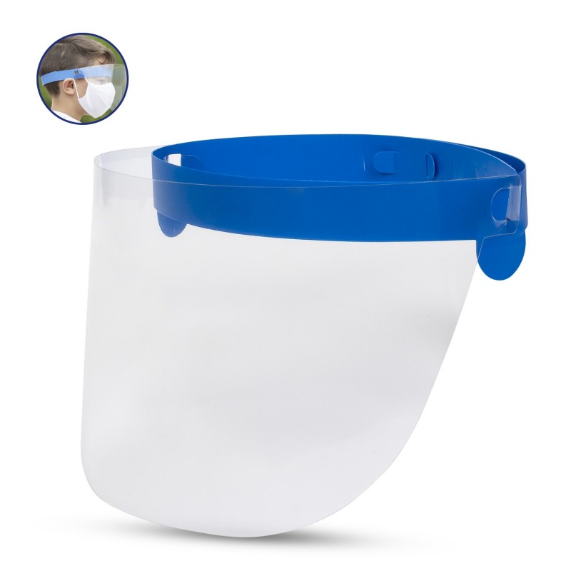 Pantalla facial para niño con cinta ajustable para la cabeza y almohadilla de protección para un cómodo ajuste en la frente. Fácil de desinfectar después de cada uso, con soportes laterales para las bandas elásticas de la mascarilla. Proporciona aislamiento frente a salpicaduras y partículas en zonas especialmente sensibles, como el área ocular, nariz y boca. 12 posiciones de regulación de diámetro. PET y PP.