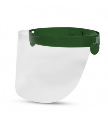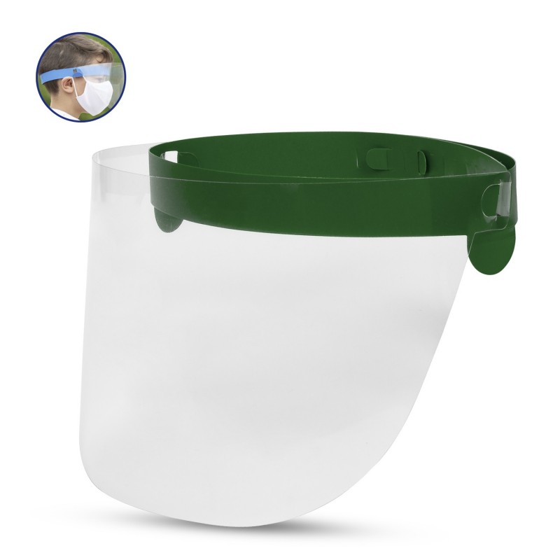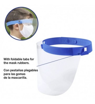 Pantalla facial para niño con cinta ajustable para la cabeza y almohadilla de protección para un cómodo ajuste en la frente. Fácil de desinfectar después de cada uso, con soportes laterales para las bandas elásticas de la mascarilla. Proporciona aislamiento frente a salpicaduras y partículas en zonas especialmente sensibles, como el área ocular, nariz y boca. 12 posiciones de regulación de diámetro. PET y PP.
