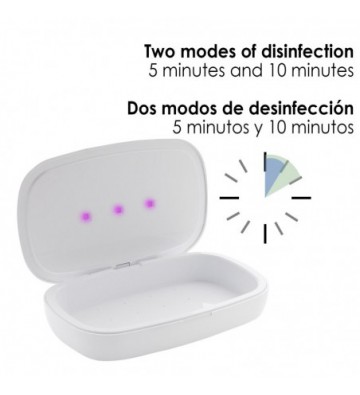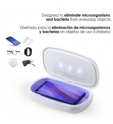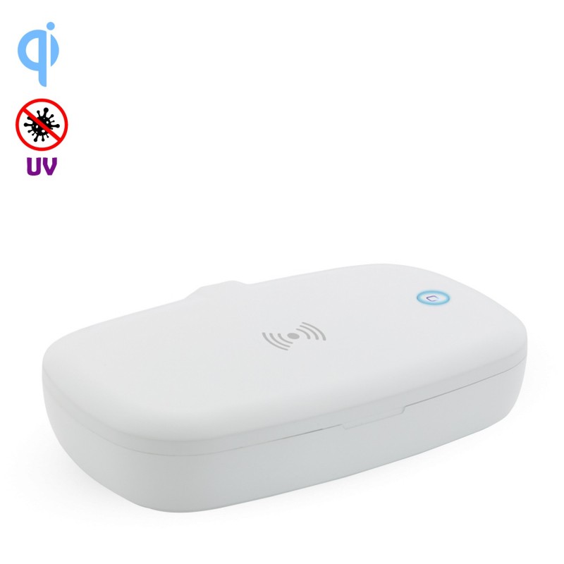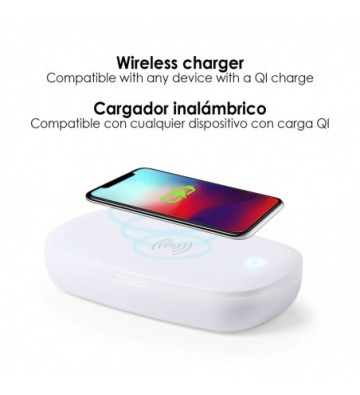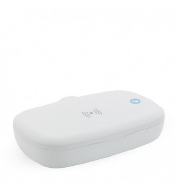 Caja esterilizadora de luz ultravioleta tipo C, con cargador inalámbrico integrado en la tapa. Diseñada para la eliminación de microorganismos y bacterias en objetos de uso cotidiano. Fabricada en resistente material ABS de acabado mate • 1 Luz UVC: 2 x 0.5W • 1 Luz UVA: 1 x 0.2W • Longitud de onda UVC: 270 - 280nm • Tiempo de exposición: 5 y 10 minutos • Certificación CE, RoHS y de efectividad germicida • Alimentación mediante cable USB Tipo C. • Certificación CE, RoHS y de efectividad germicida. PVC y aleación de metal