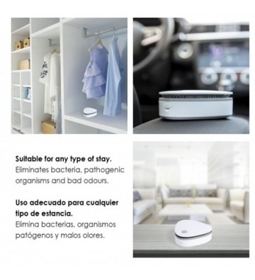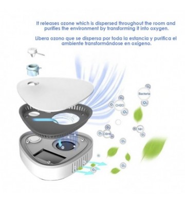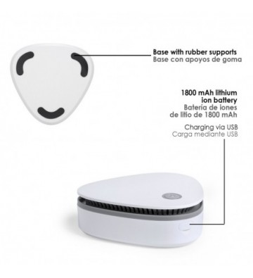 Generador de ozono Trick. Gracias al poder higienizante y desinfectante del ozono, se eliminan bacterias y otros microorganismos patógenos, eliminando también los malos olores del lugar tratado. Dos modos de funcionamiento. Recargable mediante cable USB (incluido), con batería de iones de litio. Base antideslizante. Recargable mediante cable USB (incluido). Batería de iones de litio de 1.800 mAh a 12V. Certificado RoHS, CE y de efectividad germicida. PVC y Aleación de metal