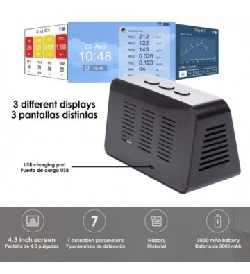 • Detector multifuncional de calidad del aire con funciones de reloj y de registro.