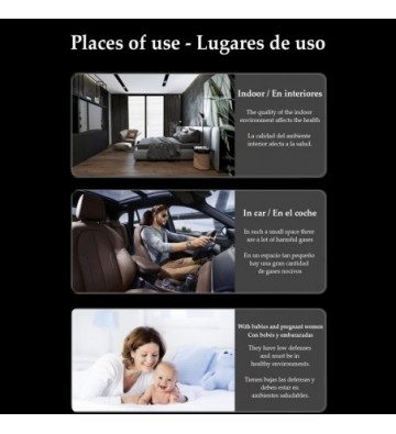 • 3 colores indicativos de la calidad del aire: verde (buena), amarillo (polución moderada) y rojo (polución severa).