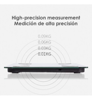 Báscula solar inteligente Bluetooth. App con análisis corporal: • Báscula de baño de múltiples funciones, con sensor de temperatura. • Robusta y duradera: la plataforma de la báscula es de vidrio templado, resistente a los golpes, apto para todos los tipos de cuerpo, fácil de almacenar, se puede poner en el baño o en cualquier lugar de la casa. • Alta precisión: última versión en sensores de alta precisión, amplio rango de pesaje, máximo peso de 180 kg / 400 libras. • Fácil de visualizar y utilizar: pantalla el LCD de alto brillo, ideal para uso diurno y nocturno. • Inicio automático cuando se pisa, la pantalla se iluminará para la medición estable, y después de unos segundos, la pantalla se apagará. • Modo de carga: carga por energía solar. • Función: medir peso, medir agua, medir grasa, medir calorías. • Funciones adicionales: prueba de grasa corporal. • Descarga la aplicación, conéctala a tu smartphone por bluetooth y lleva un registro de tus mediciones. Bluetooth: 4.0 Alimentación: batería interna con carga solar / luz artificial Máxima capacidad: 180 kg Mínima capacidad: 3 kg Precisión: 100 gr. PVC Aleación_de_Metal