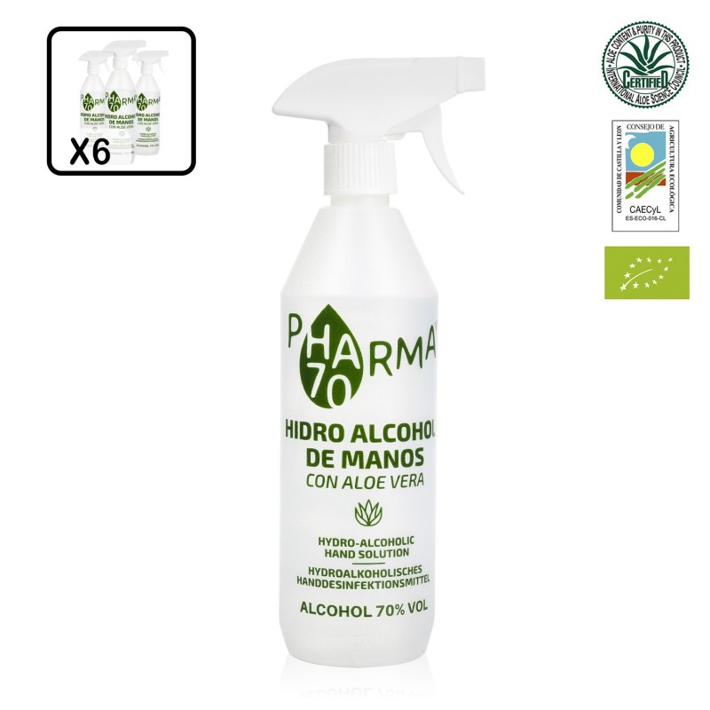 • Solución hidroalcohólica líquida, exclusivamente con etanol 96º y aloe vera con certificados ecológicos regional y europeo. • Producto totalmente natural. • Nuestra solución no sólo garantiza el 70% de volumen en alcohol y la máxima eficacia, sino también la posibilidad de que sea pulverizada, lo que facilita su aplicación dérmica y/o en guantes u otras superficies. • 6 botellas de 500ml con pulverizador incorporado. Alcohol denat, agua, extracto de Aloe Vera
