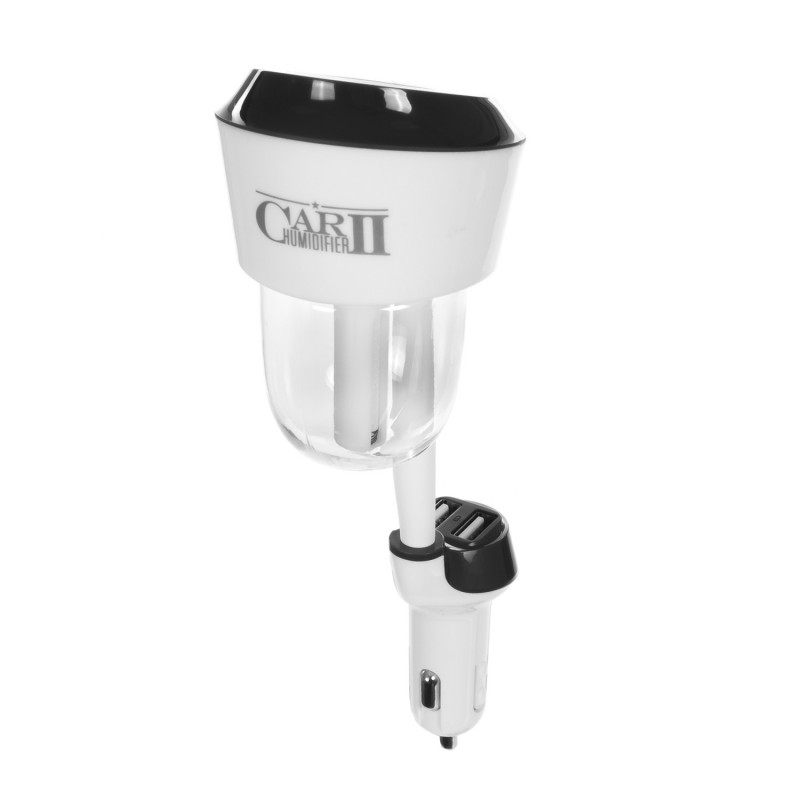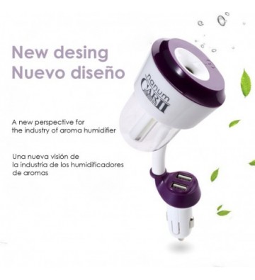Humidificador con aroma para coches. Purifica el aire y mejora la calidad del mismo. Toma de corriente mediante enchufe de 12V. Posee 2 Puestos USB integrados Diseño con cabezal basculante y cuerpo flexible capaz de adaptarse a cualquier posición. Deposito extraíble de 50ml Input: 12V - 24V Coriente: 120mA - 280mA Capacidad: 50ml Gasto: 20-30 ML/hora Temperatura de trabajo: 0 - 45º PVC Aleación_de_Metal