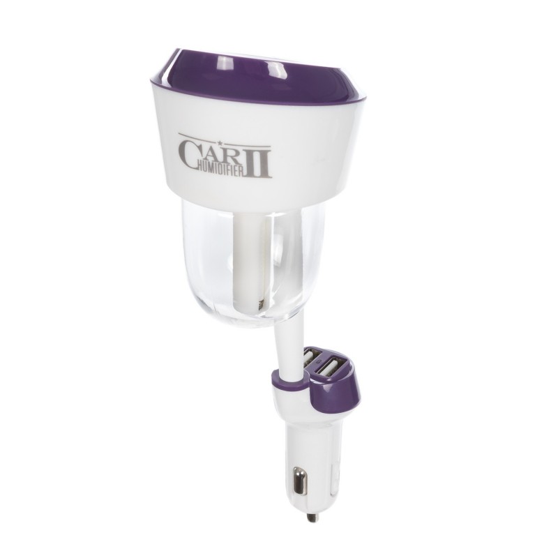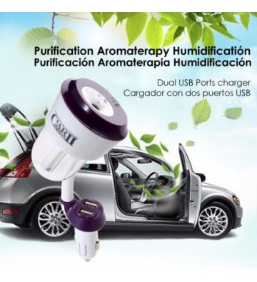 Humidificador con aroma para coches. Purifica el aire y mejora la calidad del mismo. Toma de corriente mediante enchufe de 12V. Posee 2 Puestos USB integrados Diseño con cabezal basculante y cuerpo flexible capaz de adaptarse a cualquier posición. Deposito extraíble de 50ml Input: 12V - 24V Coriente: 120mA - 280mA Capacidad: 50ml Gasto: 20-30 ML/hora Temperatura de trabajo: 0 - 45º PVC Aleación_de_Metal