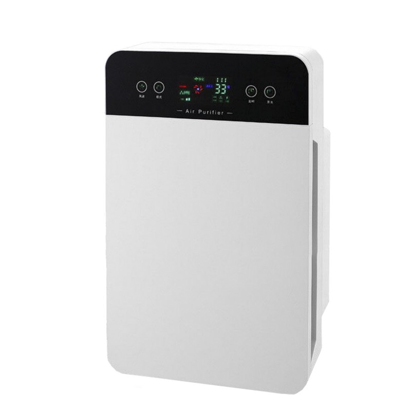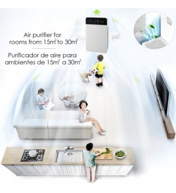 Purificador de aire ionizador para ambientes de hasta 50m2. Tipos de filtro que contiene: -Filtro primario -HEPA -Carbón activo -Catalizador frio (eliminación de formaldehido) -Iones Negativos Temporizador para: -2 Horas -4 Horas -6 Horas -8 Horas Velocidad del ventilador variable. Control remoto mediante mando a distancia. Especificaciones: Voltaje: 220V Potencia: 35W Vida útil de los filtros: 1 año aprox. Incluye mando de control remoto y cable de alimentación PVC Aleación_de_Metal