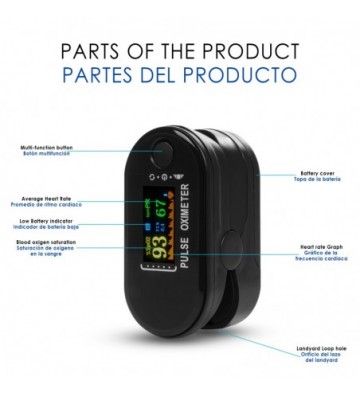 Pulsómetro de dedo inalámbrico. • Gráfico de cardiograma , ritmo cardíaco medio y medición de oxígeno en sangre. • Medición mediante tunel de rayos infrarojos. • Funciona con dos pilas AAA. • Incluye lanyard de transporte de 40 cm de longitud con enganche rápido. Interior recubierto con silicona. Batería: 2 pilas AAA no incluidas Longitud del landyard: 40 cm Temperatura de trabajo: entre 5º y 40º PVC Aleación_de_Metal